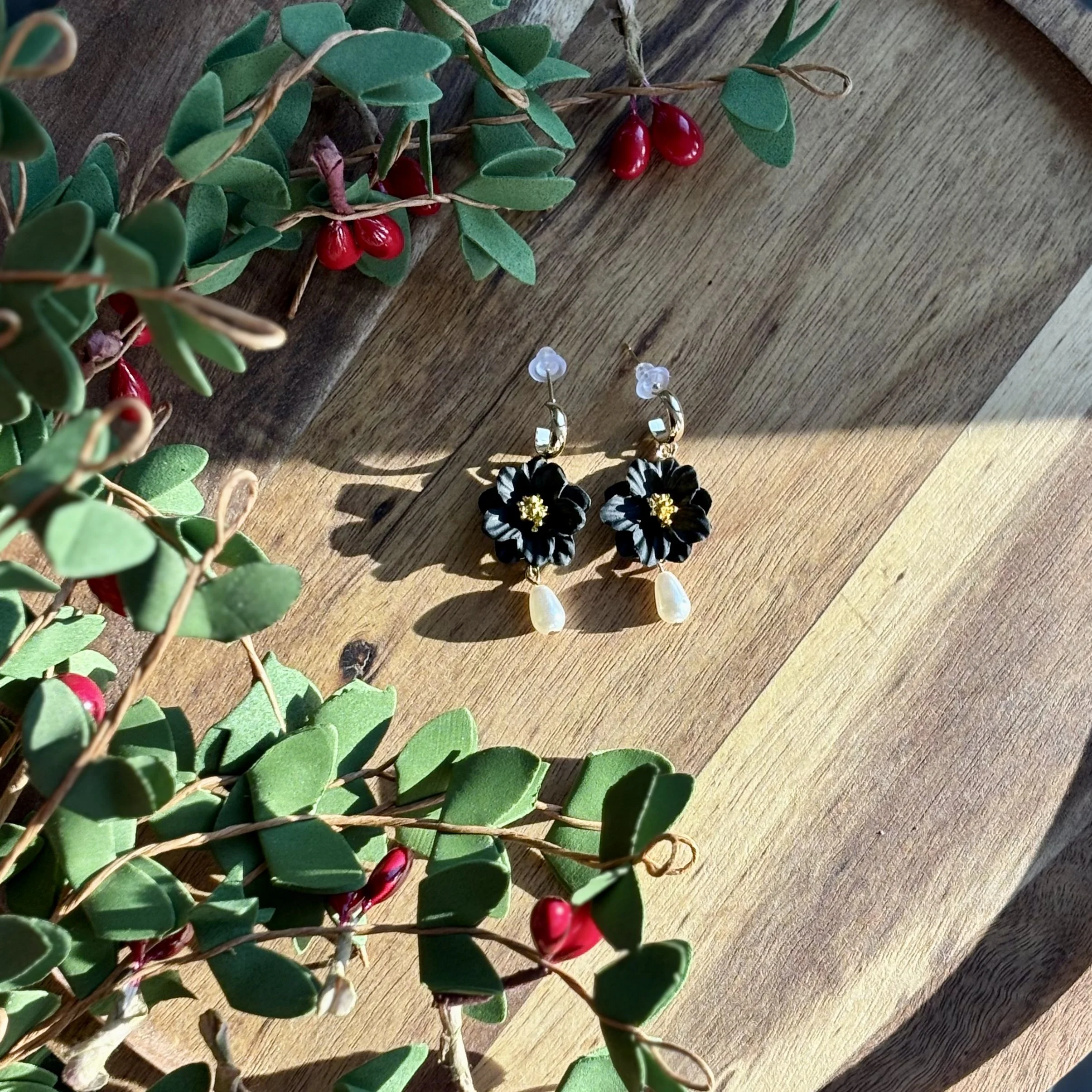 Artistry truly meets elegance with The Addison. Each earring features a delicately sculpted clay flower in black accented with a metallic center and a dainty pearl drop for the perfect touch of sophistication.