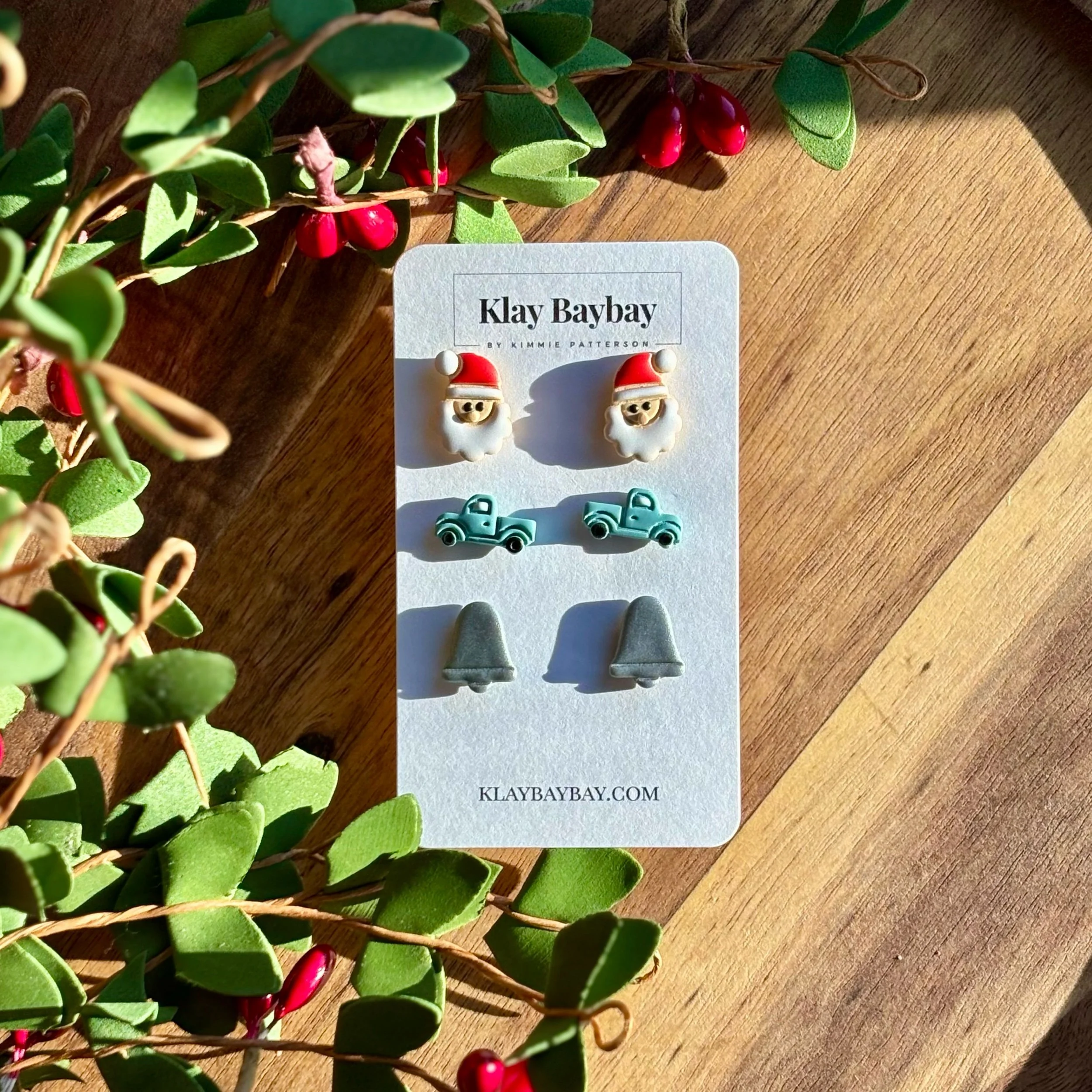 For the first time ever - a 3 pack of holiday studs! This seasonal set includes three adorable designs — mirrored Santas, vintage trucks, and silver bells — perfect for mixing, matching, or gifting.