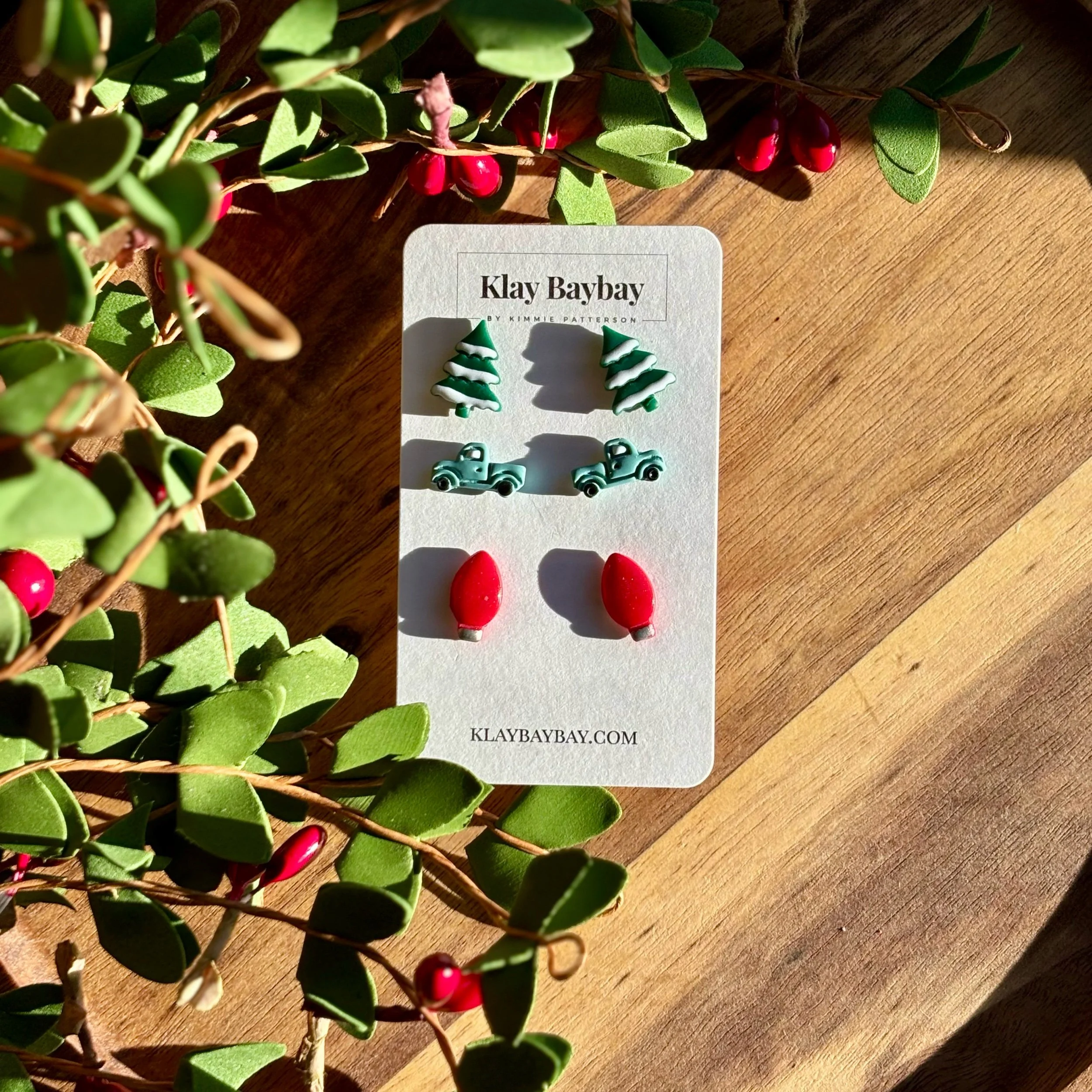 For the first time ever - a 3 pack of holiday studs! This seasonal set includes three adorable designs — a snowy pine tree, a classic truck, and bright red Christmas lights — perfect for mixing, matching, or gifting.