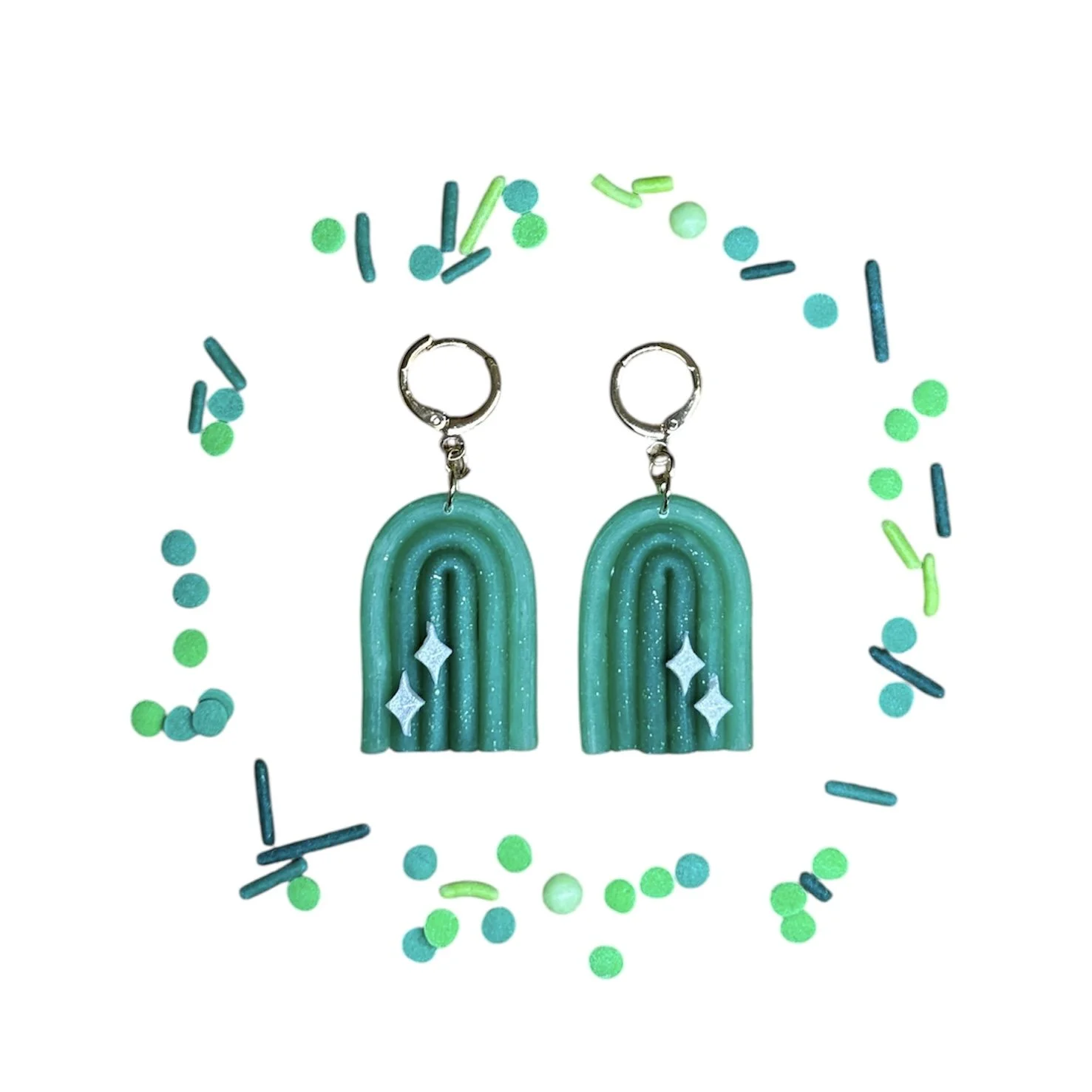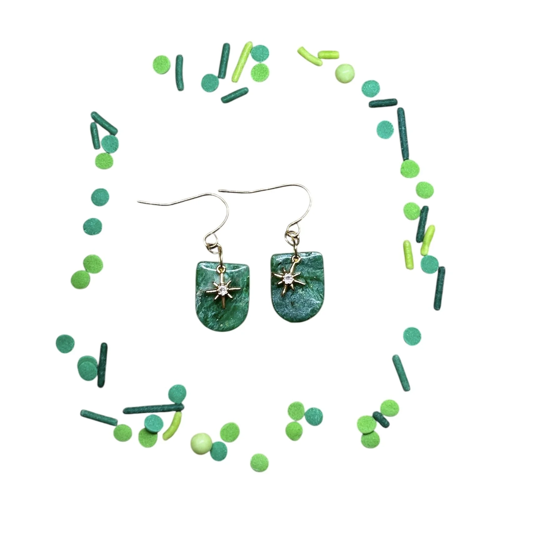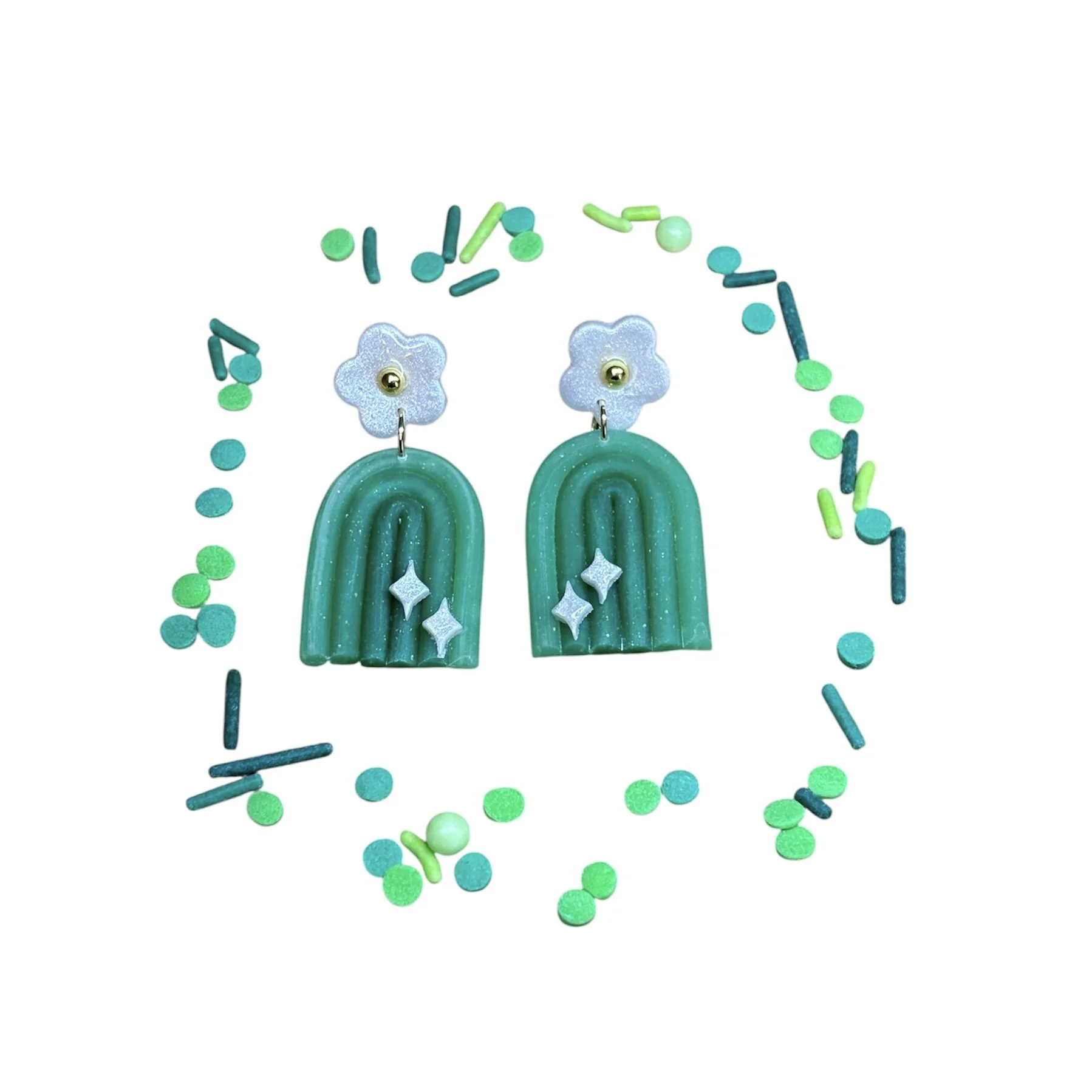 These geometric earrings are made from polymer clay and are incredibly light weight. There is so much to LOOK AT with these earrings, from the pearl flower post, resin glazed and adorned with a gold bead stamen to the translucent greens marbled with gold foil.